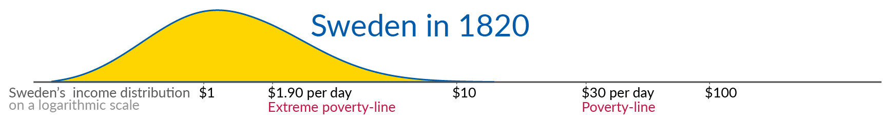 The global data makes clear why the world needs much more growth to end poverty. The world as a whole today is in a situation not so different from Sweden a century ago. The majority of the world left extreme poverty behind, but is still far poorer than $30 a day.