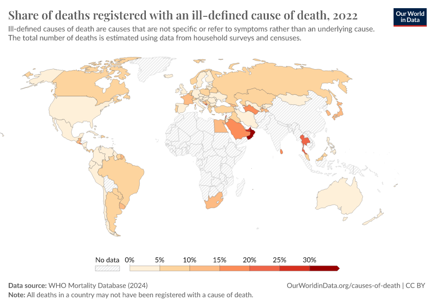 On the chart, you can see the share of deaths registered with an ill-defined cause of death across countries.