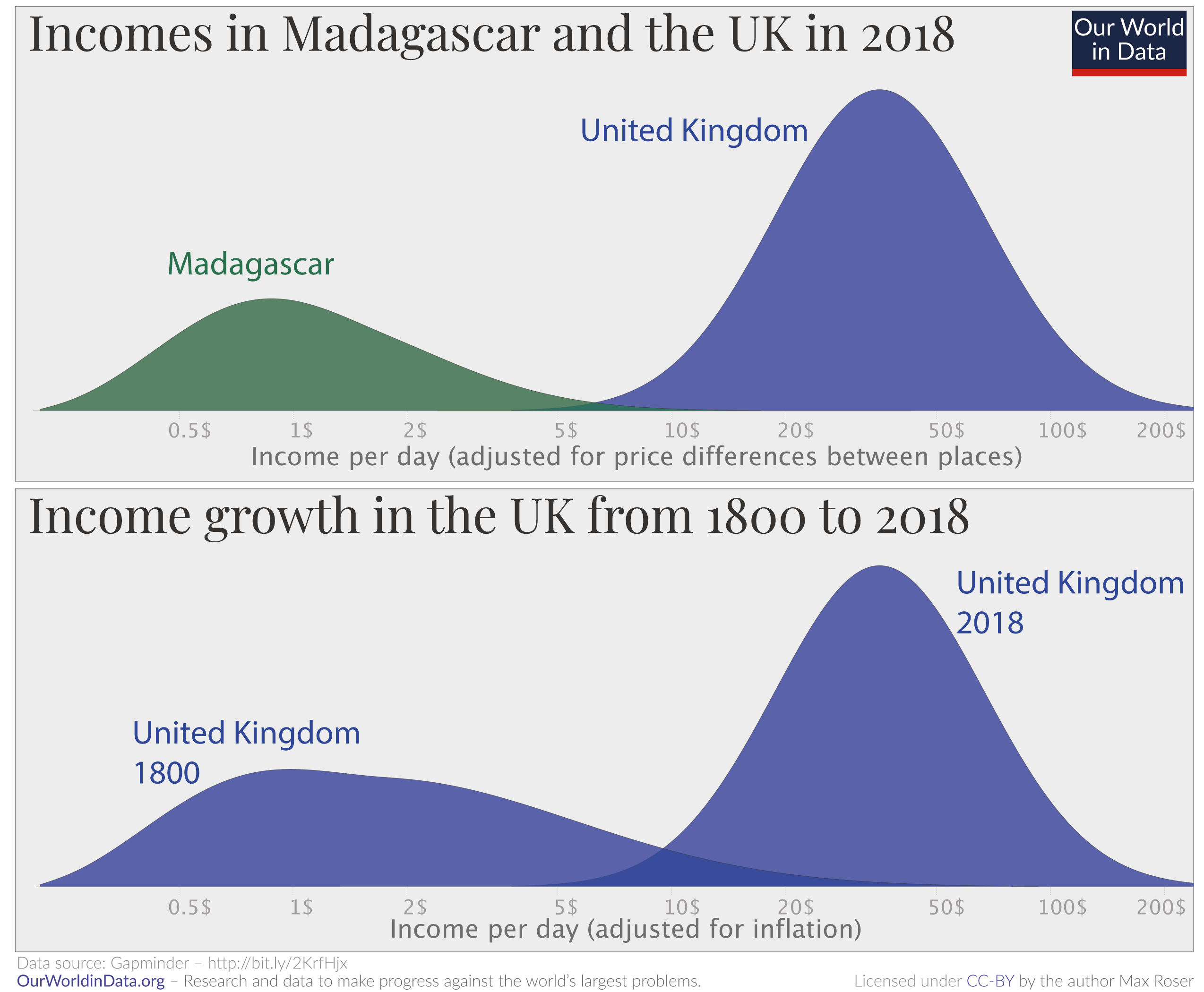 The chart on the top compares estimates of the income distribution in Madagascar (in green) and the UK (in blue) in 2018. The income differences between people in these two countries are extremely large. The current average income in Madagascar today is $1.50 per day.6 This means that even the richer half of Madagascar’s population live on incomes between only $2 to $5 per day, much less than even poor people in the UK.