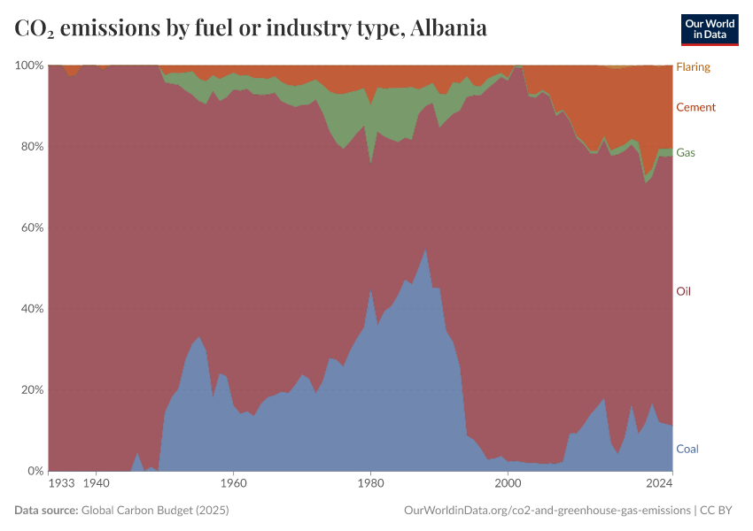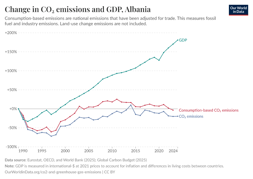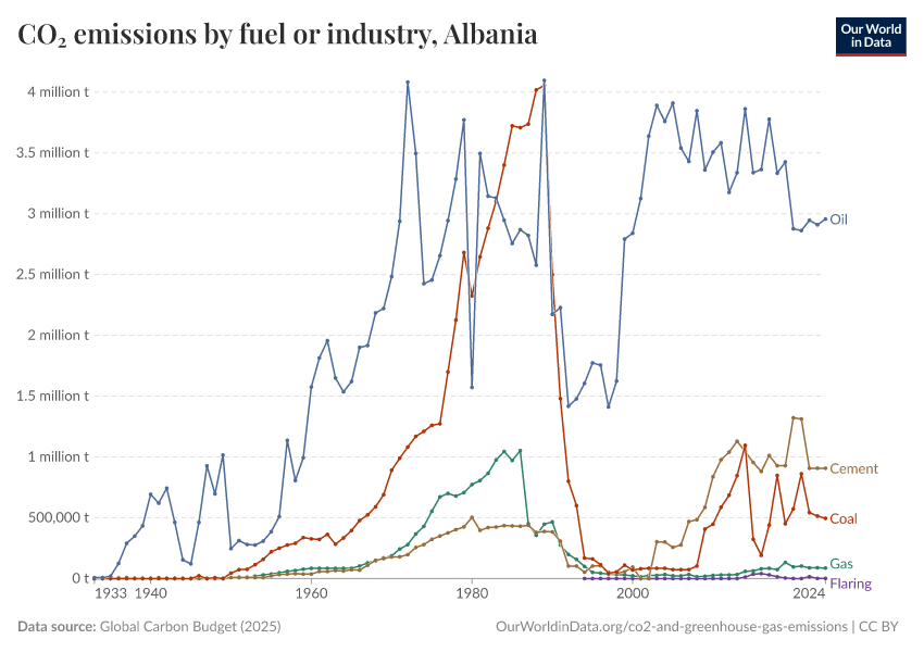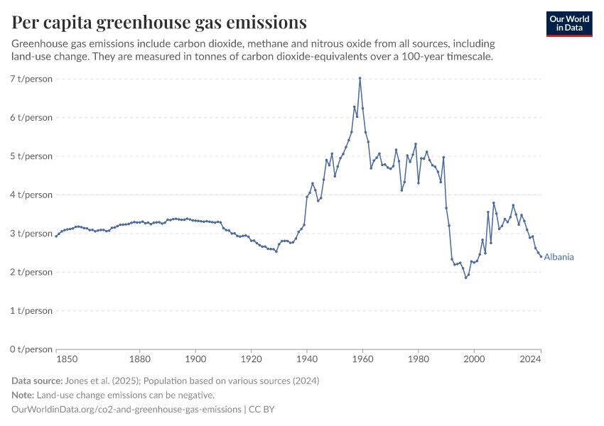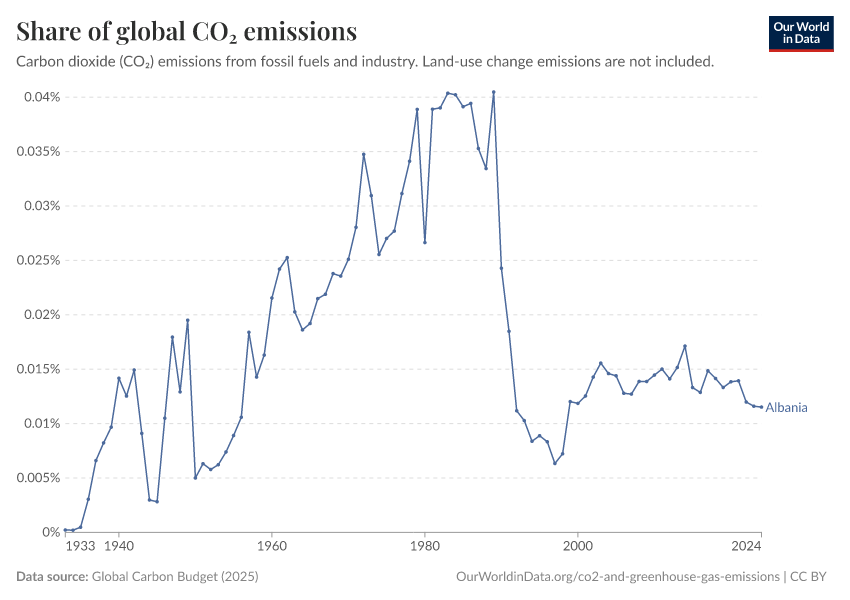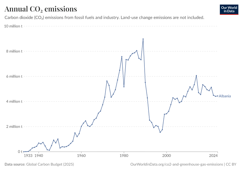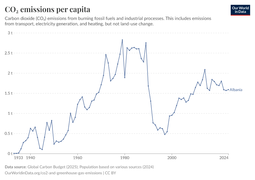 Hannah Ritchie (2025) - “CO₂ and Greenhouse Gas Emissions” Published online at OurWorldinData.org. Retrieved from: 'https://ourworldindata.org/profile/co2/albania' [Online Resource]BibTeX citation