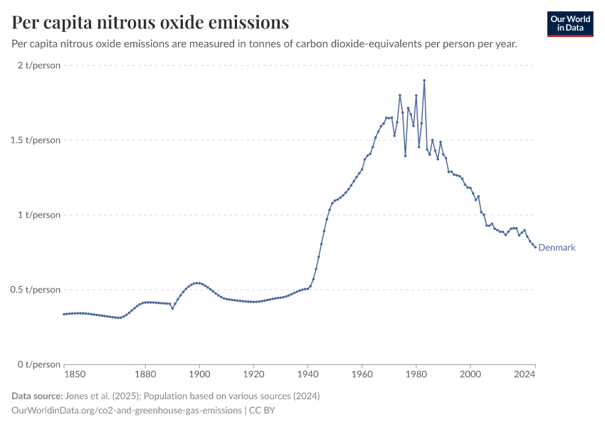 This first interactive chart here shows per capita emissions of nitrous oxide each year. This is measured in ‘carbon dioxide equivalents’.