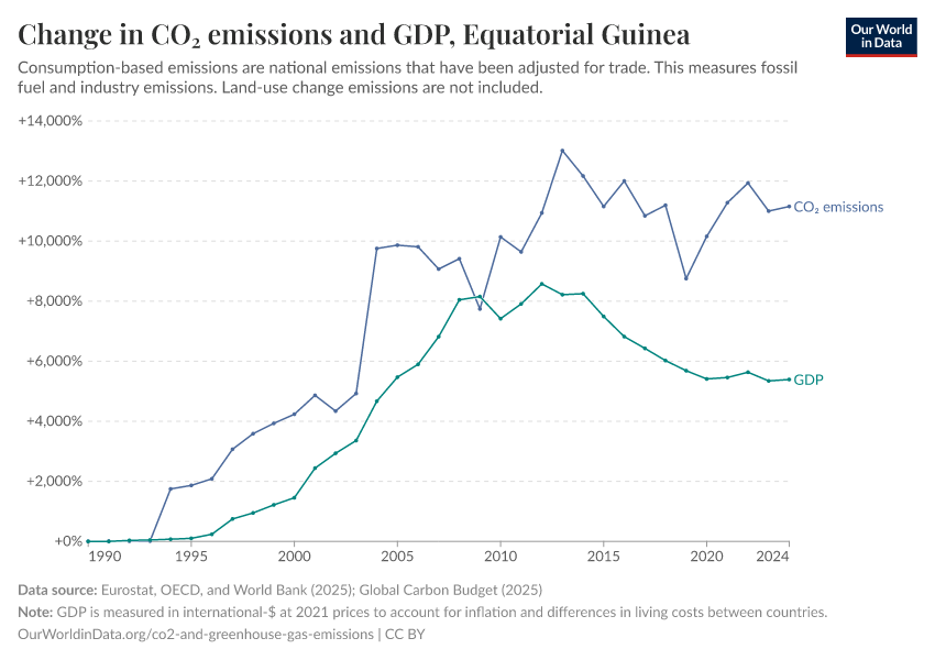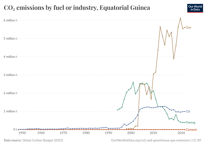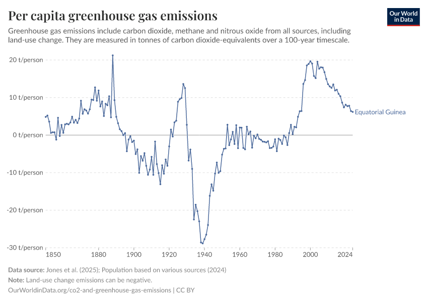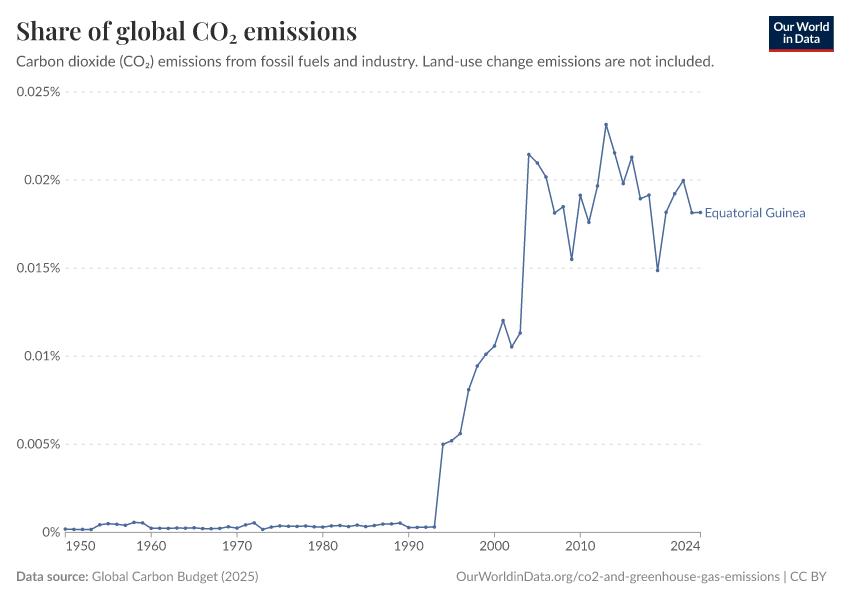 Hannah Ritchie (2025) - “CO₂ and Greenhouse Gas Emissions” Published online at OurWorldinData.org. Retrieved from: 'https://ourworldindata.org/profile/co2/equatorial-guinea' [Online Resource]BibTeX citation