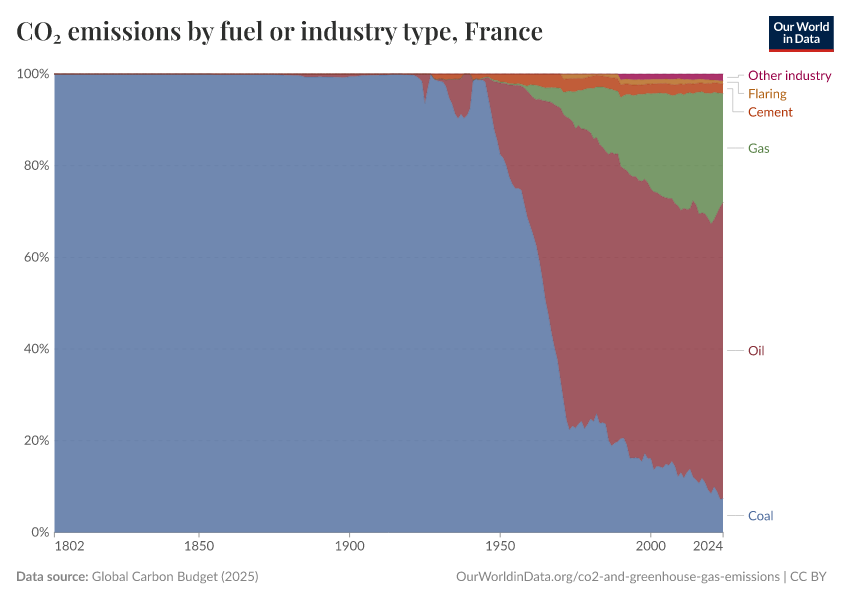 This interactive chart shows the breakdown of annual CO2 emissions by source: either coal, oil, gas, cement production or gas flaring. This breakdown is strongly influenced by the energy mix of a given country, and changes as a country shifts to or from a given energy source.