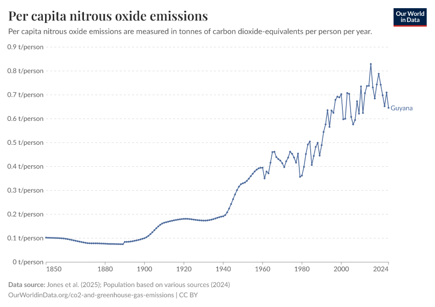 Nitrous oxide: how much does the average person in Guyana emit? Where do emissions come from?