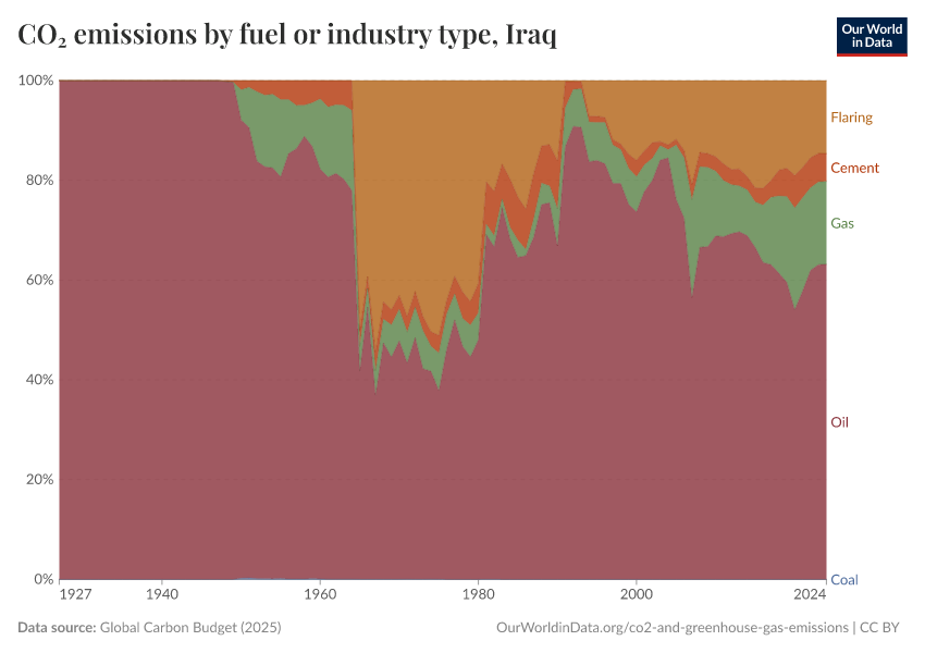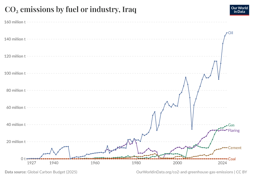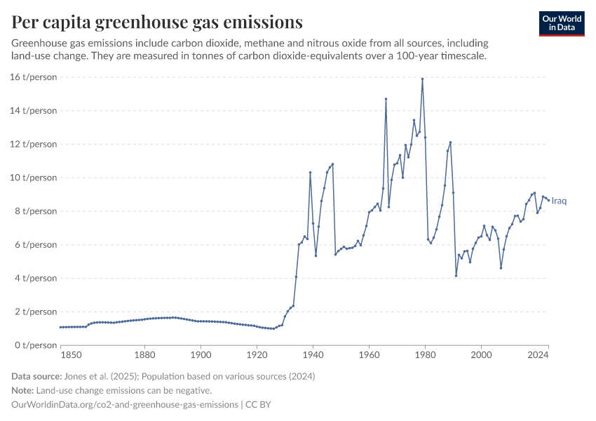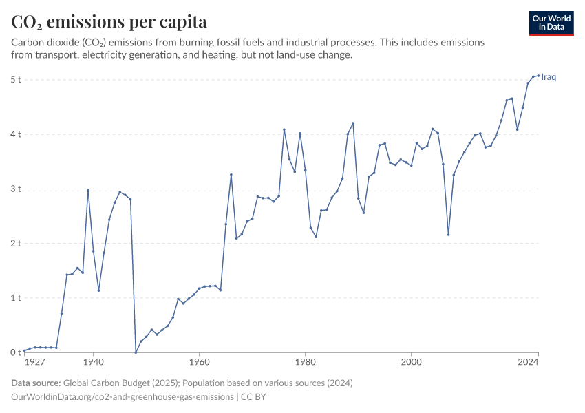 Hannah Ritchie (2025) - “CO₂ and Greenhouse Gas Emissions” Published online at OurWorldinData.org. Retrieved from: 'https://ourworldindata.org/profile/co2/iraq' [Online Resource]BibTeX citation
