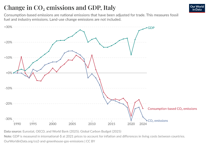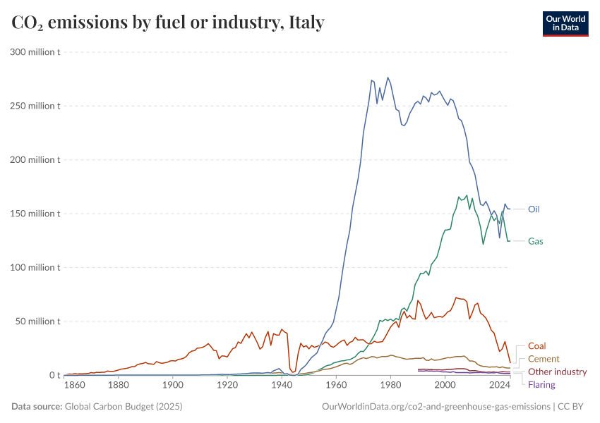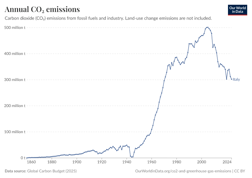 Hannah Ritchie (2025) - “CO₂ and Greenhouse Gas Emissions” Published online at OurWorldinData.org. Retrieved from: 'https://ourworldindata.org/profile/co2/italy' [Online Resource]BibTeX citation
