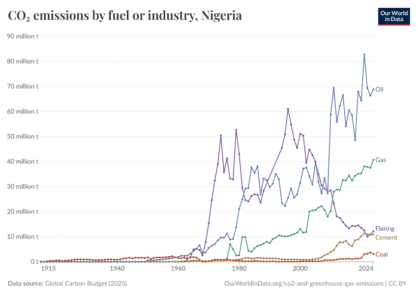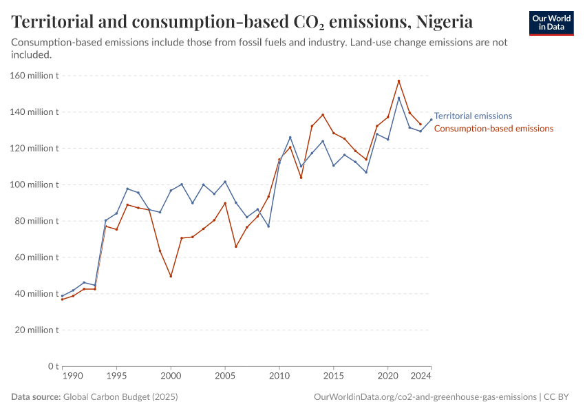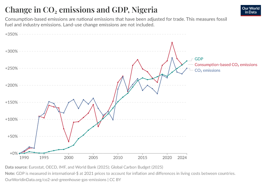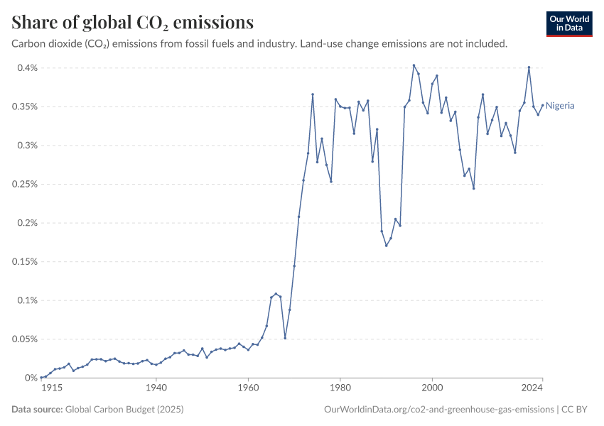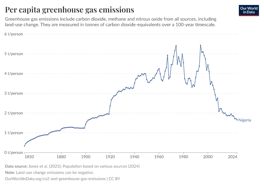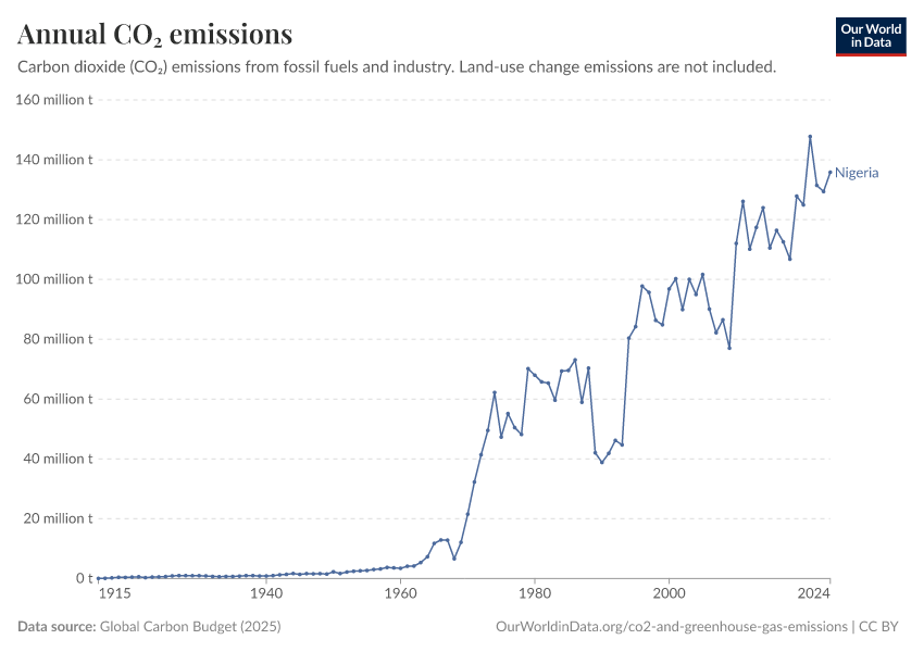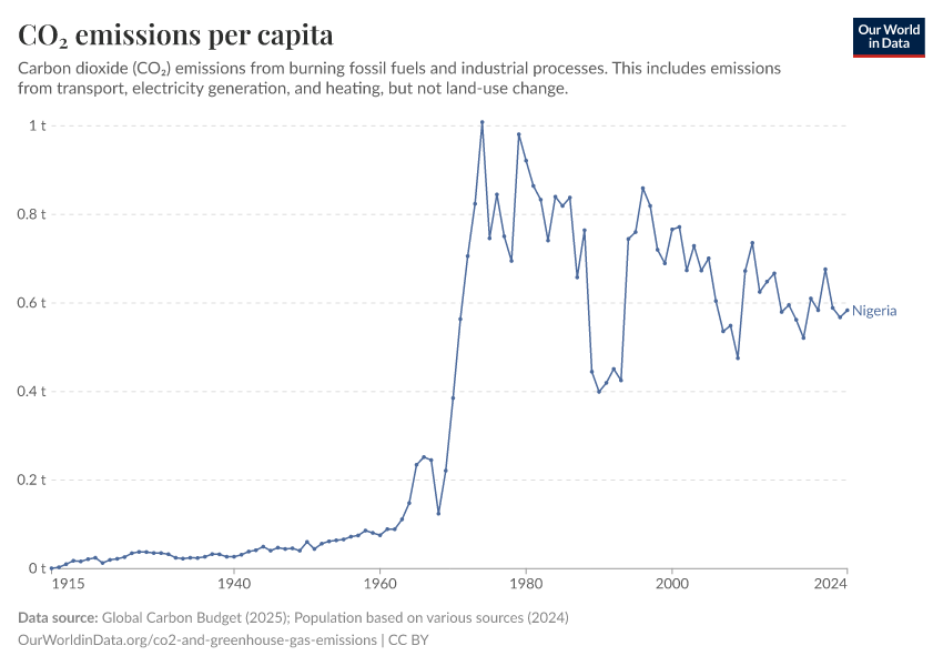 Hannah Ritchie (2025) - “CO₂ and Greenhouse Gas Emissions” Published online at OurWorldinData.org. Retrieved from: 'https://ourworldindata.org/profile/co2/nigeria' [Online Resource]BibTeX citation