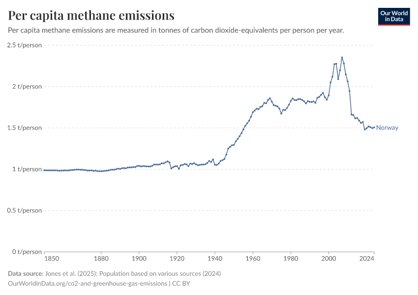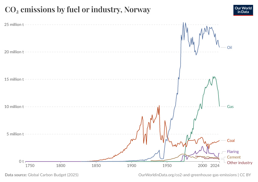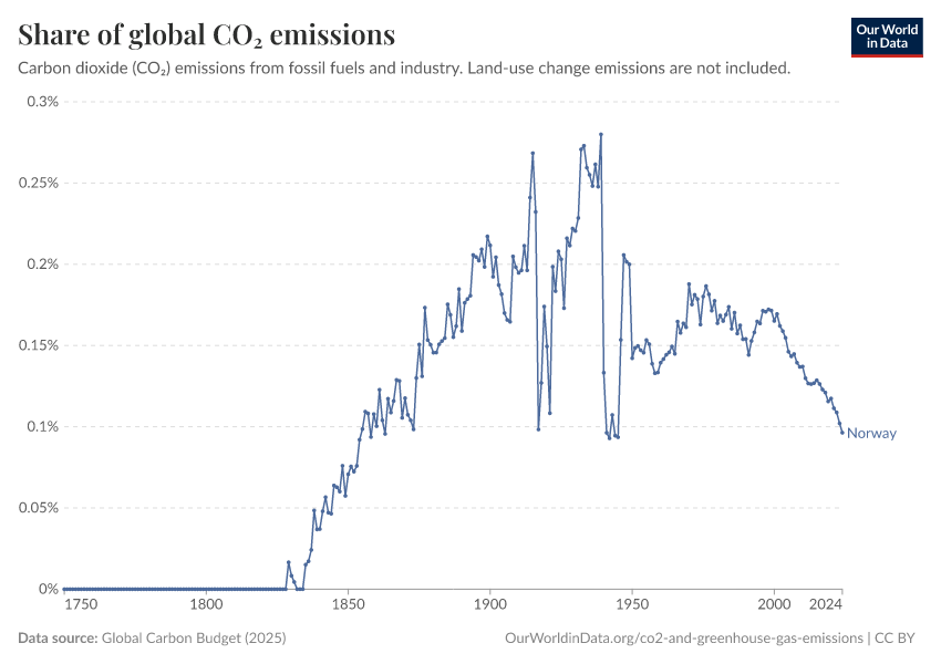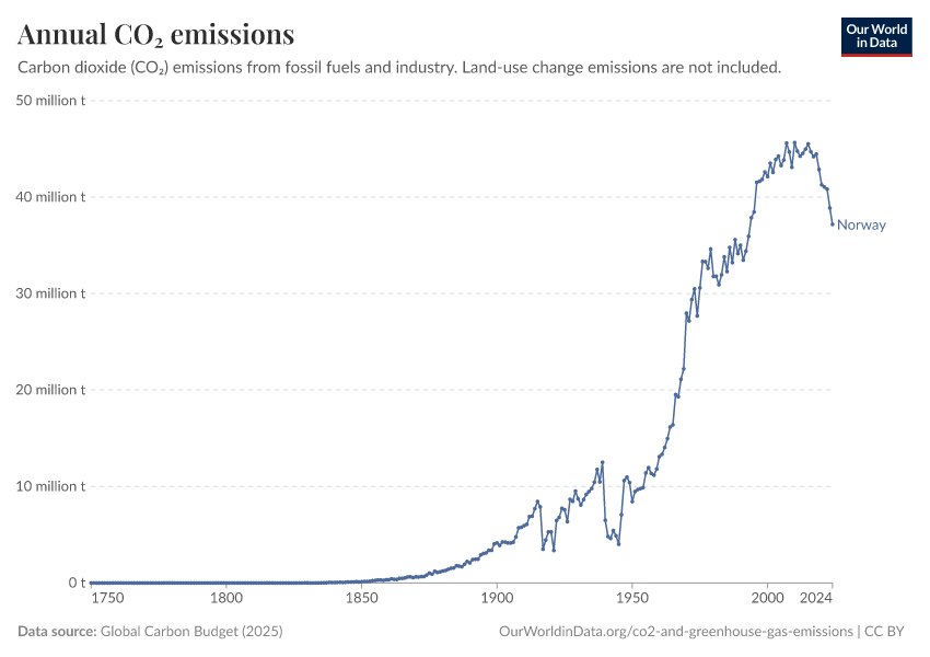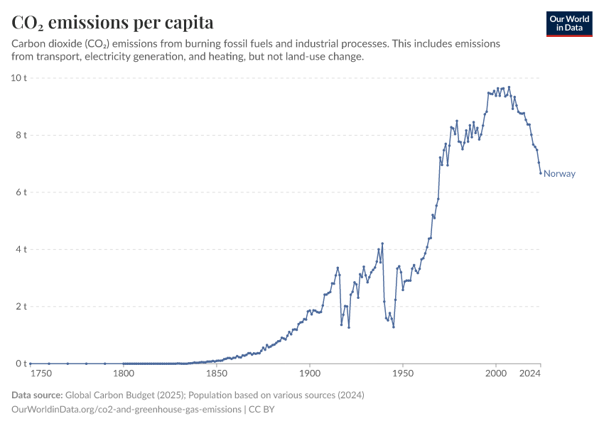 Hannah Ritchie (2025) - “CO₂ and Greenhouse Gas Emissions” Published online at OurWorldinData.org. Retrieved from: 'https://ourworldindata.org/profile/co2/norway' [Online Resource]BibTeX citation