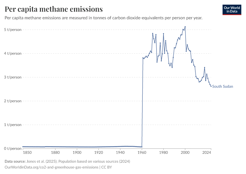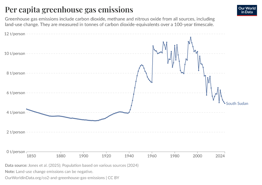 Hannah Ritchie (2025) - “CO₂ and Greenhouse Gas Emissions” Published online at OurWorldinData.org. Retrieved from: 'https://ourworldindata.org/profile/co2/south-sudan' [Online Resource]BibTeX citation