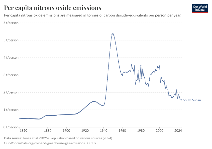 This first interactive chart here shows per capita emissions of nitrous oxide each year. This is measured in ‘carbon dioxide equivalents’.