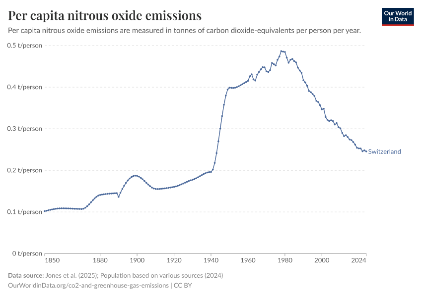 This first interactive chart here shows per capita emissions of nitrous oxide each year. This is measured in ‘carbon dioxide equivalents’.