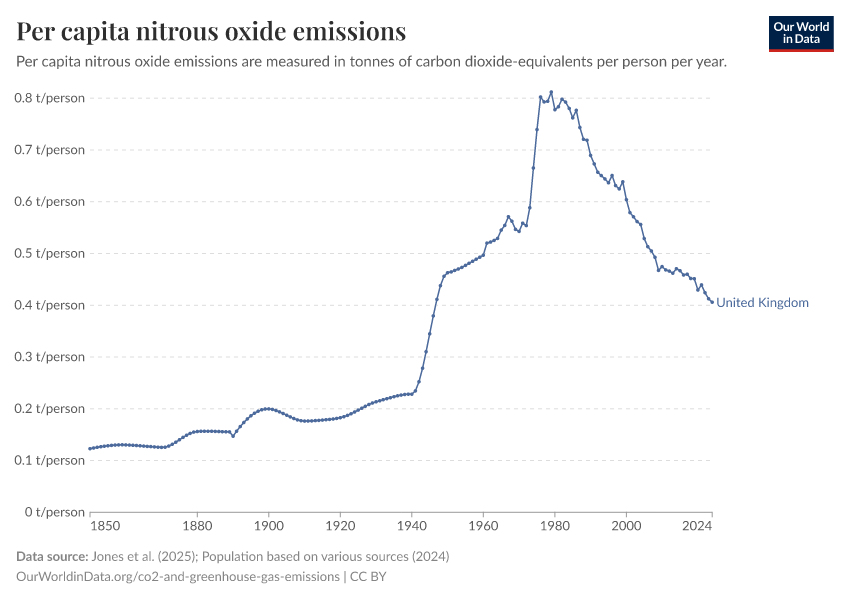 This first interactive chart here shows per capita emissions of nitrous oxide each year. This is measured in ‘carbon dioxide equivalents’.