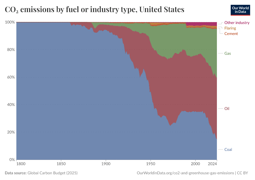 This interactive chart shows the breakdown of annual CO2 emissions by source: either coal, oil, gas, cement production or gas flaring. This breakdown is strongly influenced by the energy mix of a given country, and changes as a country shifts to or from a given energy source.