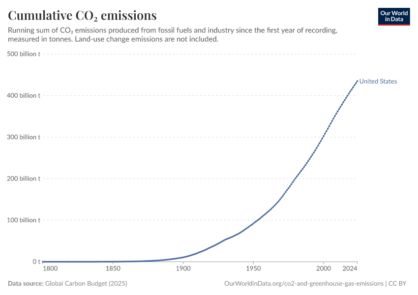 This interactive chart shows cumulative CO2 emissions — the sum of emissions produced since 1751 to the given year. This allows us to understand how much a given country has contributed to global emissions through its history.