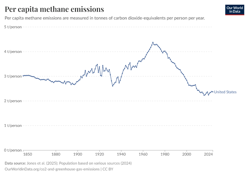 This first interactive chart here shows per capita emissions of methane each year. This is measured in ‘carbon dioxide equivalents’.