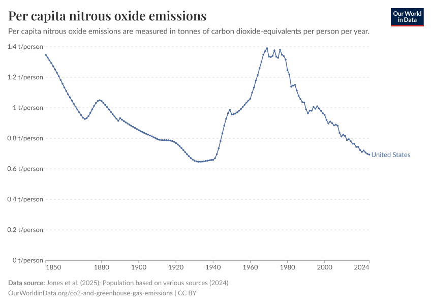 This first interactive chart here shows per capita emissions of nitrous oxide each year. This is measured in ‘carbon dioxide equivalents’.