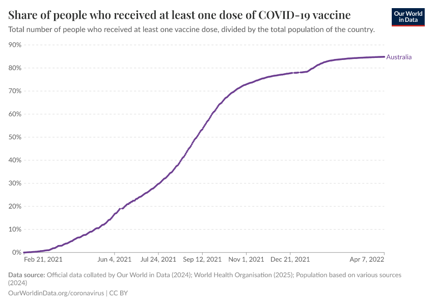 What share of Australia’s population has received at least one dose of the COVID-19 vaccine?