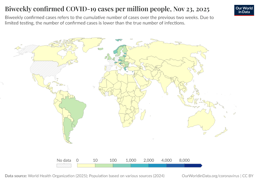 The first map here provides figures on the number of confirmed cases in the last two weeks. To enable comparisons across countries it is expressed per million people of the population.