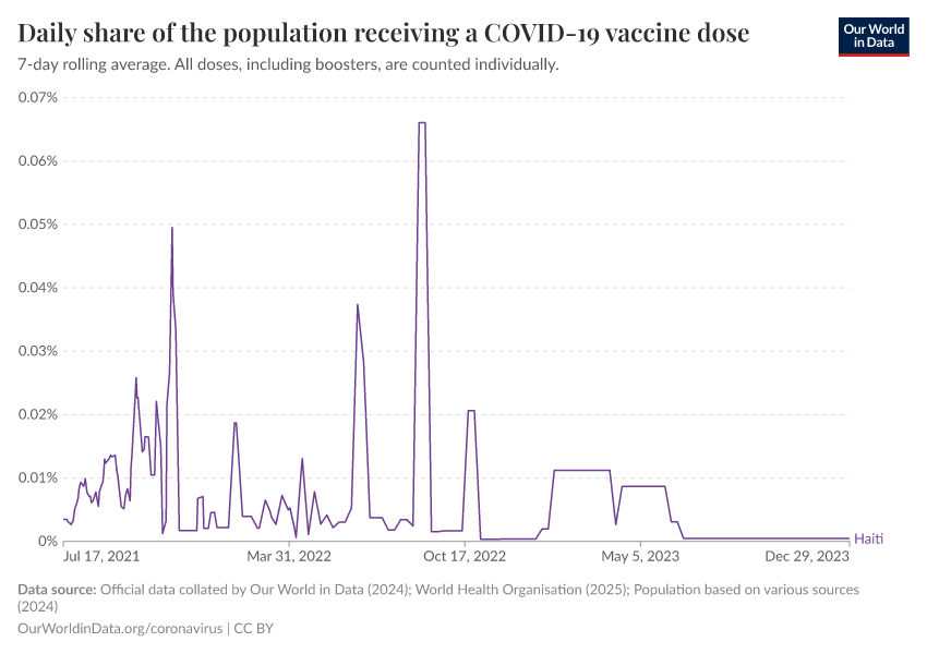 Hannah Ritchie (2025) - “Coronavirus Pandemic” Published online at OurWorldinData.org. Retrieved from: 'https://ourworldindata.org/profile/coronavirus/haiti' [Online Resource]BibTeX citation
