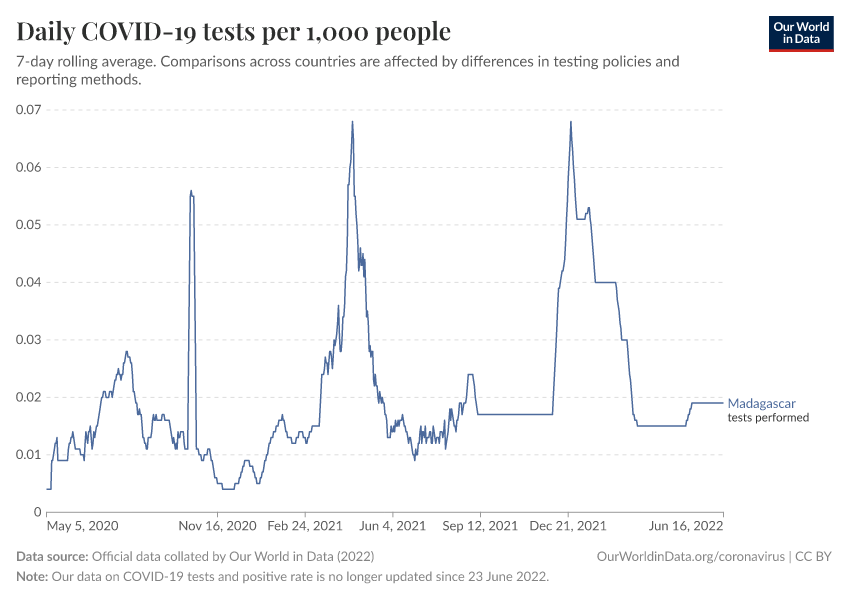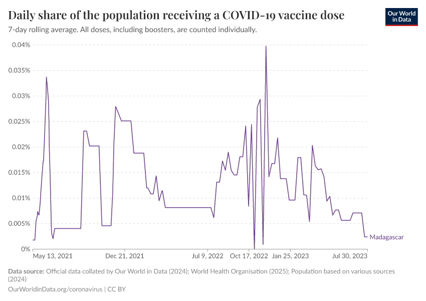 Hannah Ritchie (2025) - “Coronavirus Pandemic” Published online at OurWorldinData.org. Retrieved from: 'https://ourworldindata.org/profile/coronavirus/madagascar' [Online Resource]BibTeX citation