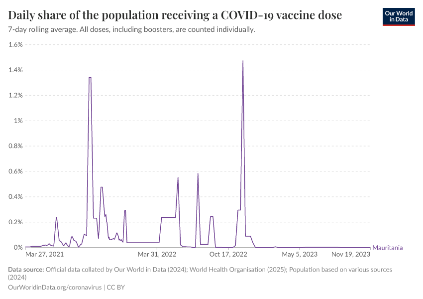 Hannah Ritchie (2025) - “Coronavirus Pandemic” Published online at OurWorldinData.org. Retrieved from: 'https://ourworldindata.org/profile/coronavirus/mauritania' [Online Resource]BibTeX citation