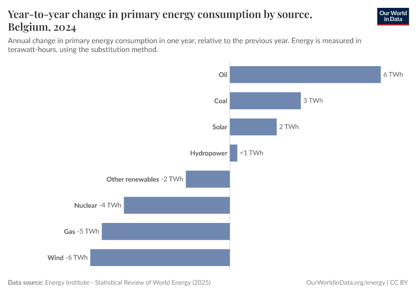 This interactive chart shows the change in primary energy consumption from these sources each year. A positive figure means the country consumed more energy from that source than the previous year; a negative means it consumed less.