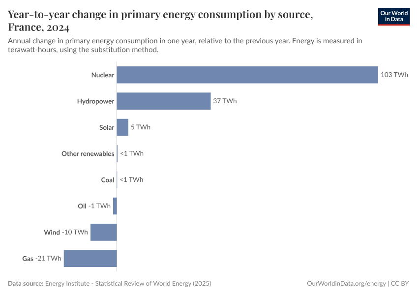 This interactive chart shows the change in primary energy consumption from these sources each year. A positive figure means the country consumed more energy from that source than the previous year; a negative means it consumed less.