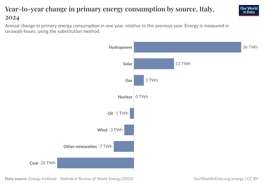 This interactive chart shows the change in primary energy consumption from these sources each year. A positive figure means the country consumed more energy from that source than the previous year; a negative means it consumed less.