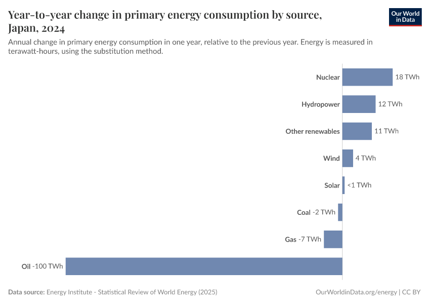 This interactive chart shows the change in primary energy consumption from these sources each year. A positive figure means the country consumed more energy from that source than the previous year; a negative means it consumed less.