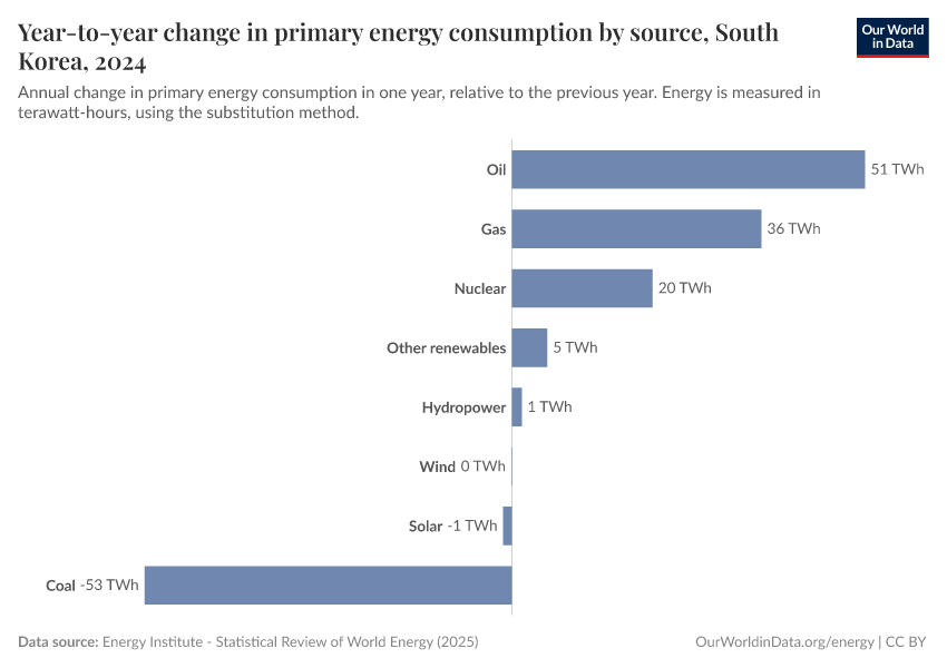 This interactive chart shows the change in primary energy consumption from these sources each year. A positive figure means the country consumed more energy from that source than the previous year; a negative means it consumed less.