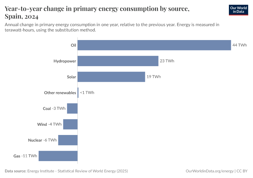 This interactive chart shows the change in primary energy consumption from these sources each year. A positive figure means the country consumed more energy from that source than the previous year; a negative means it consumed less.
