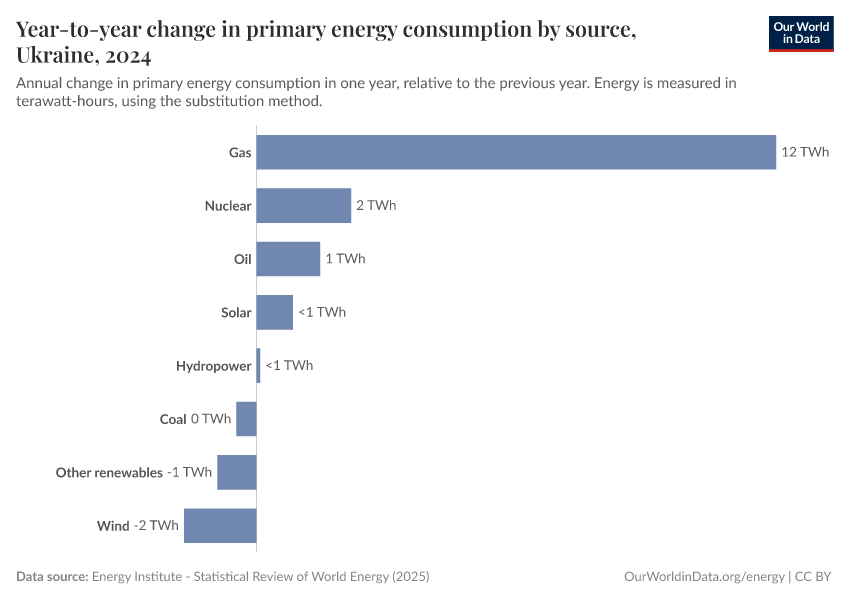 This interactive chart shows the change in primary energy consumption from these sources each year. A positive figure means the country consumed more energy from that source than the previous year; a negative means it consumed less.