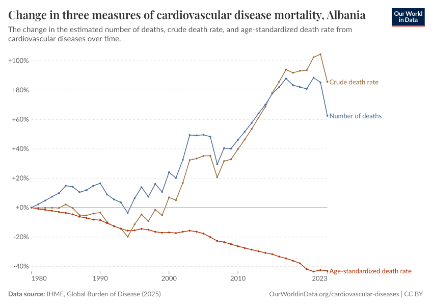 There are several metrics we can use to understand mortality: the total number of deaths, the crude death rate (which simply divides the number of deaths by the country’s population), or the age-standardized death rate, which holds the age structure of the population constant, removing the effect of population aging from the trend.