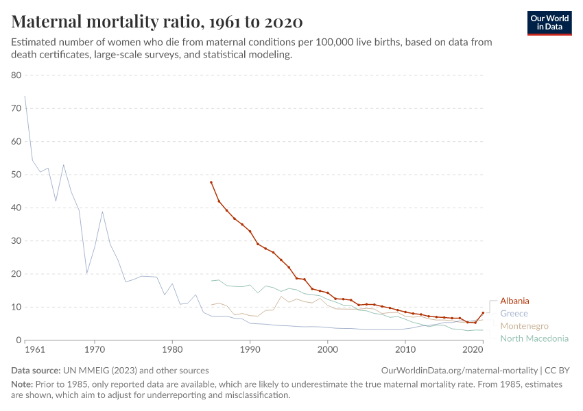 In the chart, you can see Albania’s maternal mortality rates over time, alongside neighboring countries for comparison. This is measured as the number of deaths per 100,000 live births.