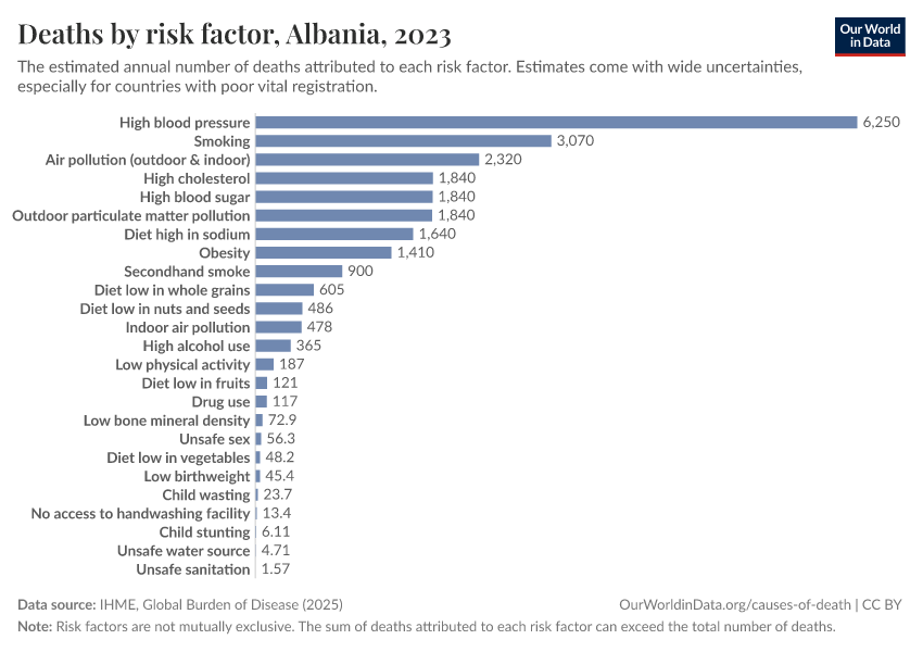 In the chart, you can see modeled estimates for how many people in Albania die prematurely as a result of various risk factors. Note that the same death can be attributed to multiple risk factors, so the death tolls from different risk factors cannot simply be added up (this is why their sum can be higher than the total number of deaths).