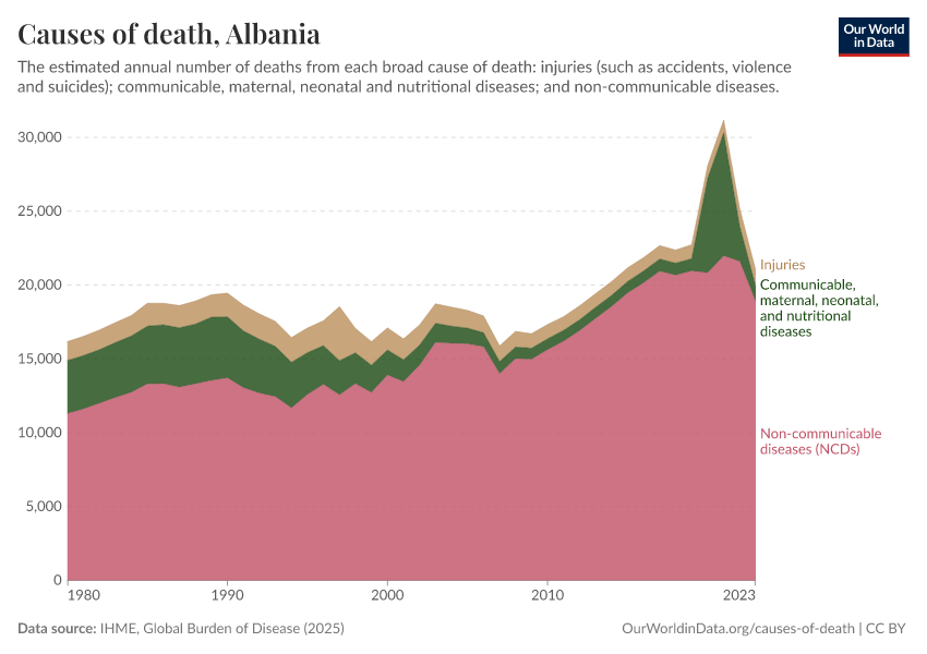 In the chart, you can see the breakdown of deaths in Albania by these broad categories. In 2023, 1,040 died from communicable diseases, 18,900 from NCDs, and 1,080 from injuries.