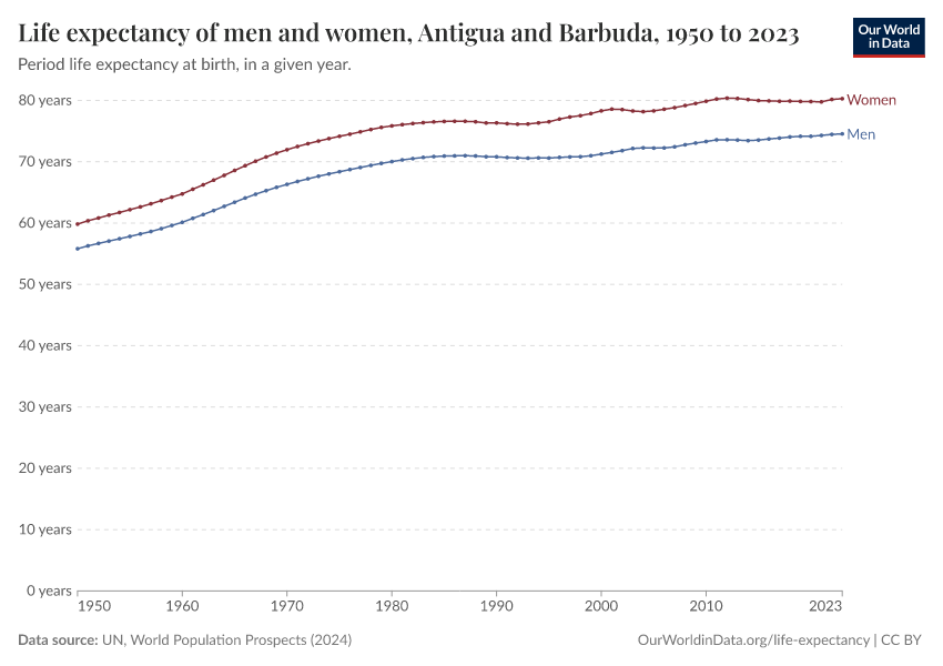 In the chart, you can see life expectancy at birth for men and women in Antigua and Barbuda.