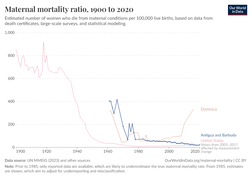 In the chart, you can see Antigua and Barbuda’s maternal mortality rates over time, alongside neighboring countries for comparison. This is measured as the number of deaths per 100,000 live births.