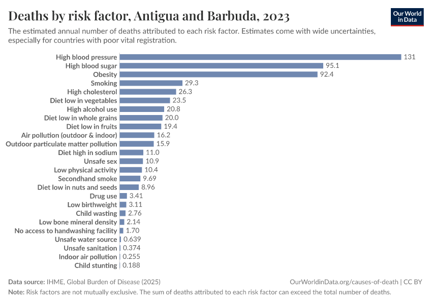 In the chart, you can see modeled estimates for how many people in Antigua and Barbuda die prematurely as a result of various risk factors. Note that the same death can be attributed to multiple risk factors, so the death tolls from different risk factors cannot simply be added up (this is why their sum can be higher than the total number of deaths).