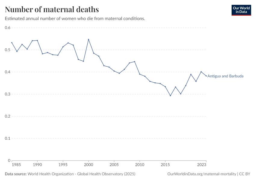 In the chart, you can see the number of women in Antigua and Barbuda who died during pregnancy or in childbirth each year. In 2023, this was <1 women.