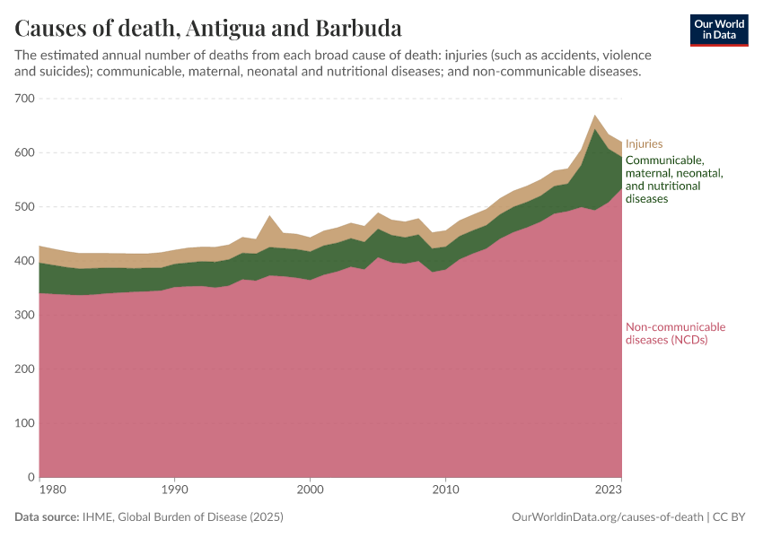 In the chart, you can see the breakdown of deaths in Antigua and Barbuda by these broad categories. In 2023, 58.2 died from communicable diseases, 534 from NCDs, and 27.5 from injuries.
