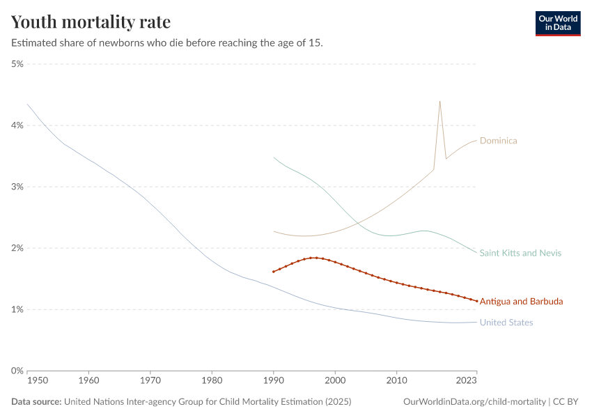 The latest data, referring to 2023, shows that 1.1% died before the age of 15 in Antigua and Barbuda.