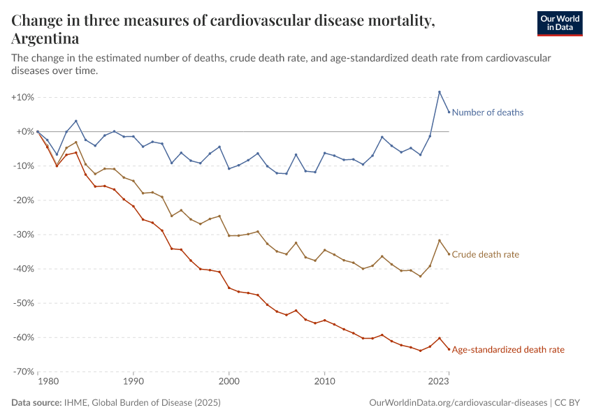 In the chart, you can see how death rates from communicable diseases in Argentina have changed over time. This is shown alongside neighboring countries for comparison.