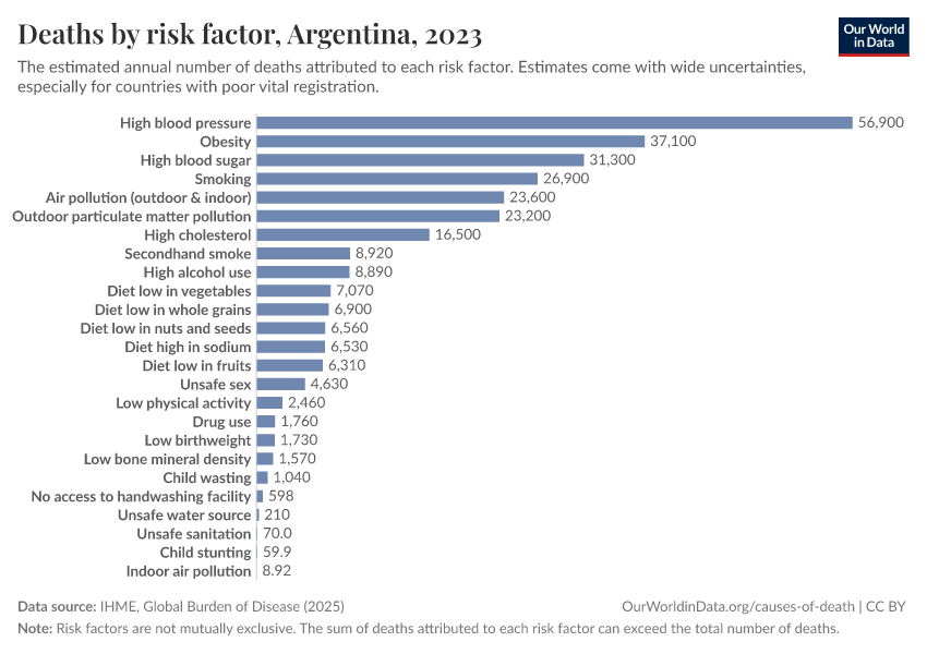 In the chart, you can see modeled estimates for how many people in Argentina die prematurely as a result of various risk factors. Note that the same death can be attributed to multiple risk factors, so the death tolls from different risk factors cannot simply be added up (this is why their sum can be higher than the total number of deaths).