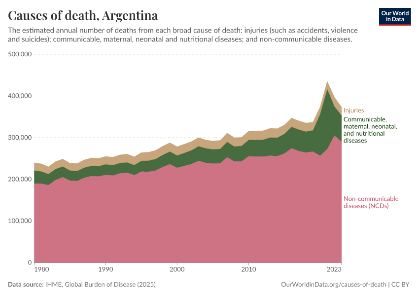 In the chart, you can see the breakdown of deaths in Argentina by these broad categories. In 2023, 62,600 died from communicable diseases, 290,000 from NCDs, and 20,200 from injuries.
