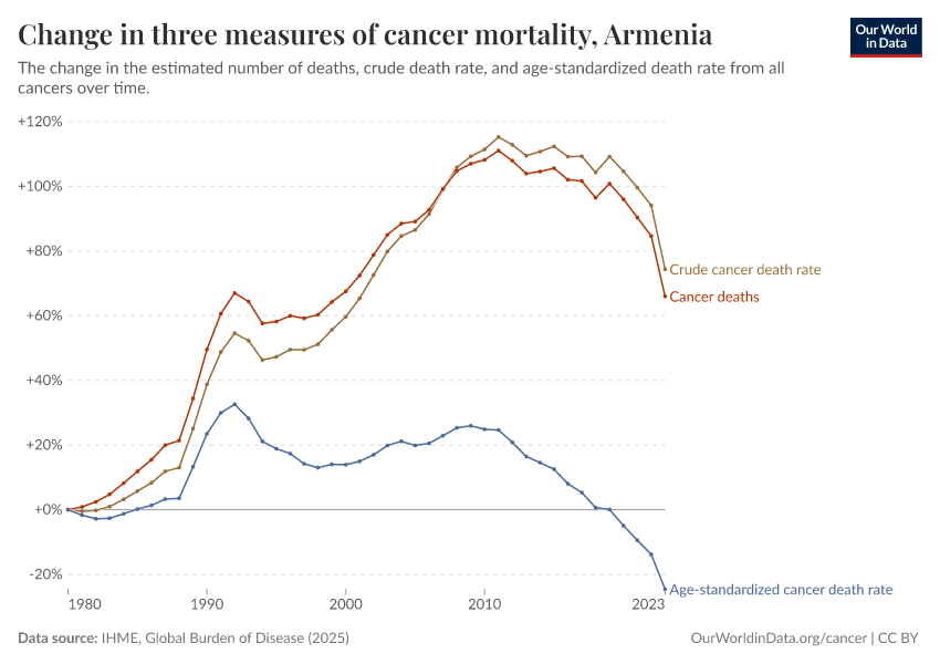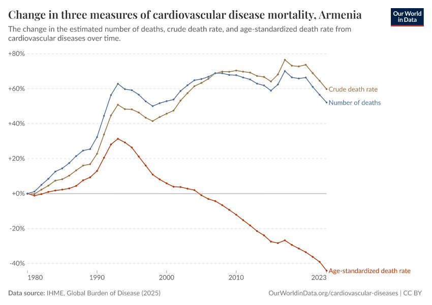 There are several metrics we can use to understand mortality: the total number of deaths, the crude death rate (which simply divides the number of deaths by the country’s population), or the age-standardized death rate, which holds the age structure of the population constant, removing the effect of population aging from the trend.