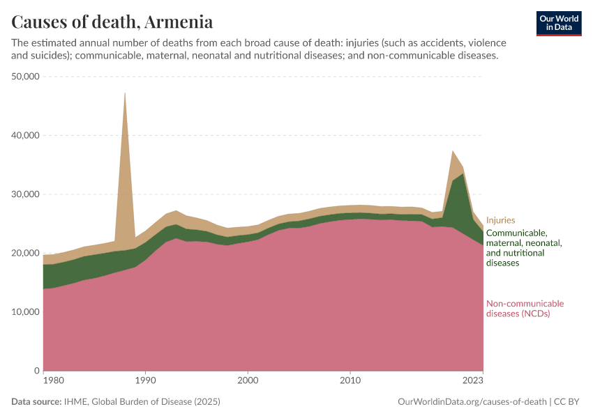 In the chart, you can see the breakdown of deaths in Armenia by these broad categories. In 2023, 2,340 died from communicable diseases, 21,300 from NCDs, and 1,030 from injuries.