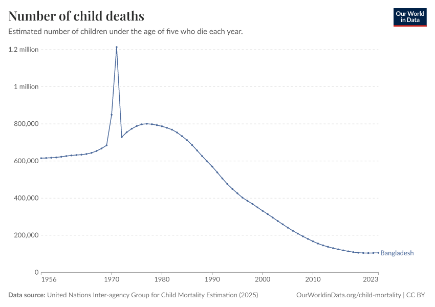 In the chart, you can see the number of children under five in Bangladesh who die in a particular year. In 2023, it was 106,000 children.