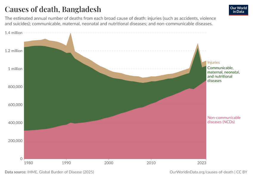 In the chart, you can see the breakdown of deaths in Bangladesh by these broad categories. In 2023, 161,000 died from communicable diseases, 872,000 from NCDs, and 57,200 from injuries.