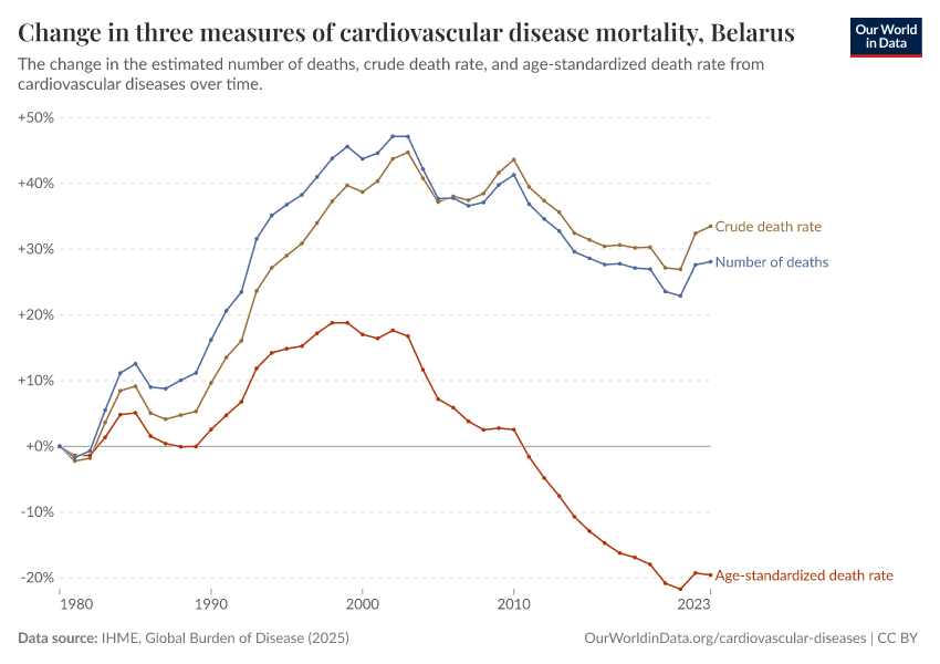 There are several metrics we can use to understand mortality: the total number of deaths, the crude death rate (which simply divides the number of deaths by the country’s population), or the age-standardized death rate, which holds the age structure of the population constant, removing the effect of population aging from the trend.